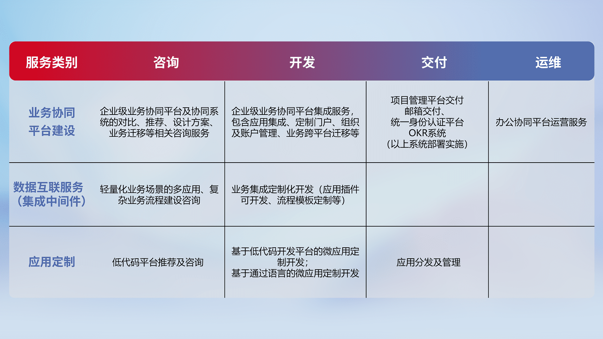 针对钉钉、、、、企微、、IDaas等平台级产品提供产品的规划、、方案、、交付、、定制化开发等服务,,,,实现如统一协同办公、、智能客户服务、、混合会议管理、、、智能数据查询、、等业务场景,,,实现数字化转型。。