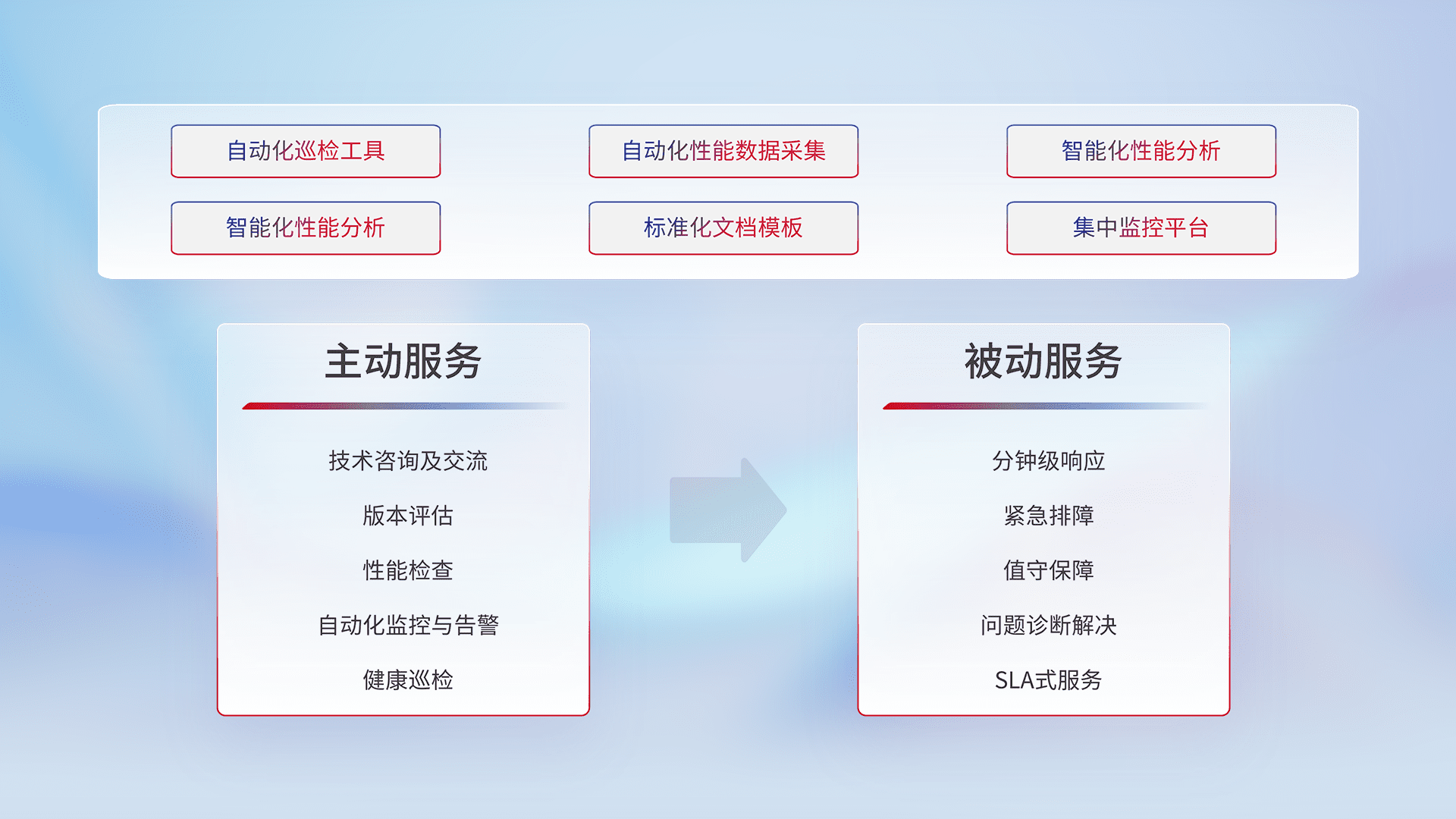 智能化工具和标准化文档,,保障服务质量,,,提供主动服务(包含技术咨询、、、、版本评估、、性能检查、、自动化监控与告警、、、、健康巡检)和被动服务包含(分钟级响应、、紧急排障、、、、值守保障、、、、问题诊断解决、、SLA服务)。。。